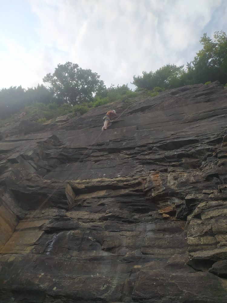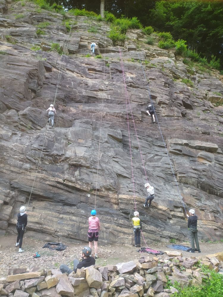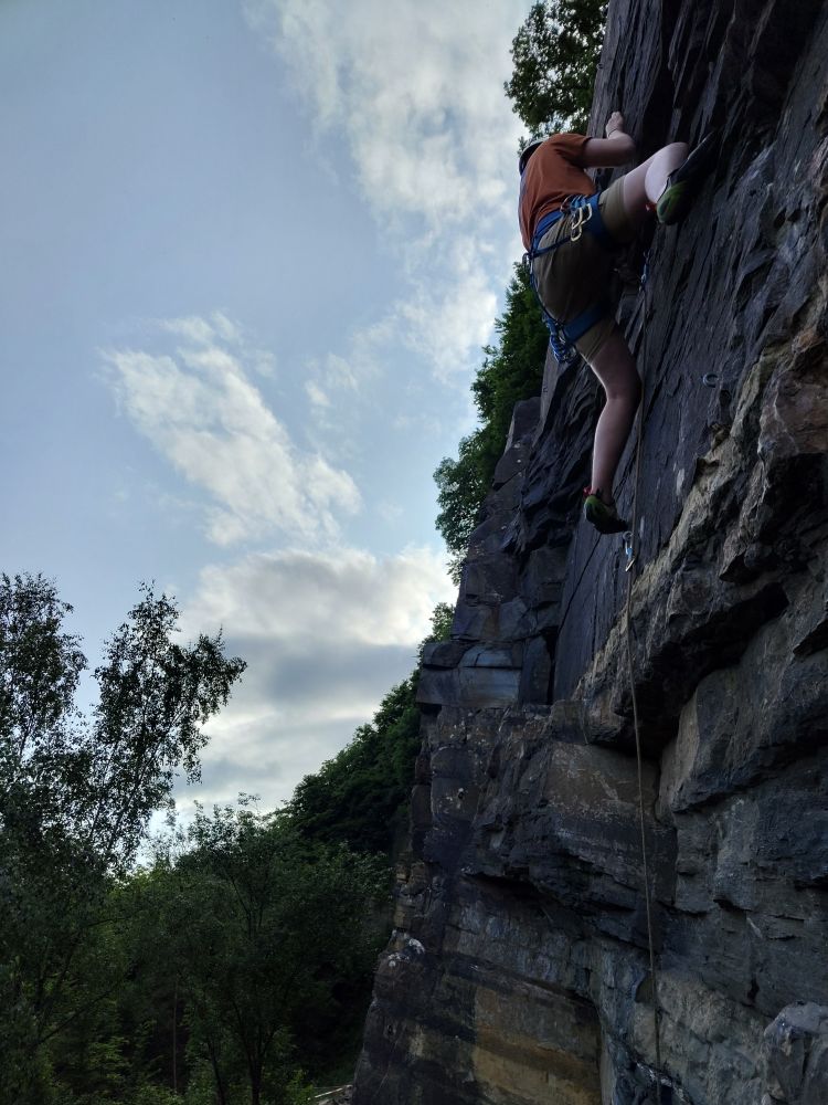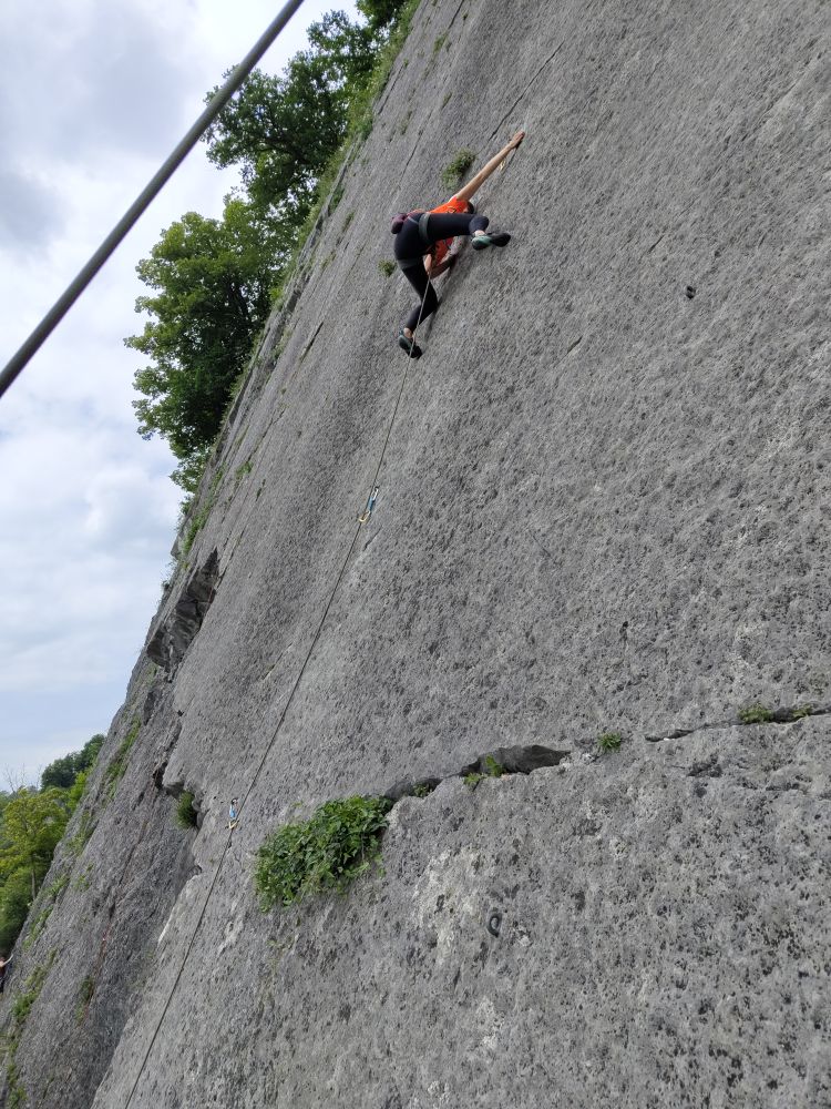 Am Montagmorgen heißt es dann schon wieder Zelte abbauen, Isomatten rollen und Schlafsäcke stopfen. Alles wird irgendwie wieder in den Autos verstaut (auch wenn es diesmal noch voller wirkt als auf der Hinfahrt). Doch bevor es nach Hause geht, steht noch ein Kletterstopp in Yvoir auf dem Programm. Hier erwarten uns lange, plattige Routen, bei denen gute Fußtechnik gefragt ist. Der eine oder die andere traut sich auch an den ersten Vorstieg und meistert ihn souverän.