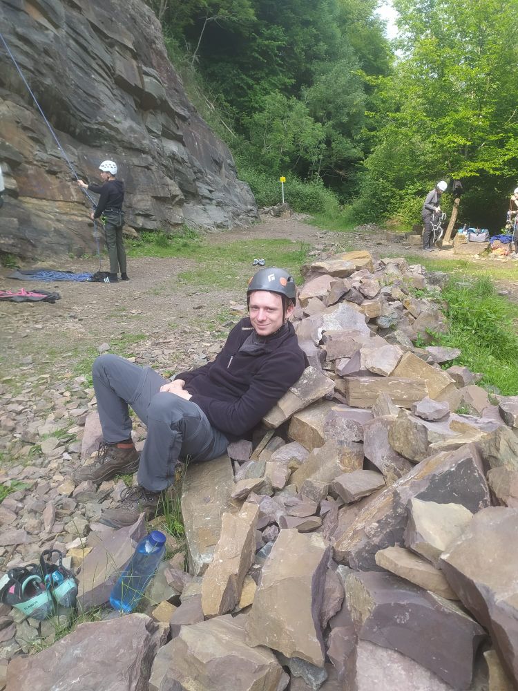 Am frühen Nachmittag erreichen wir wieder unseren Startpunkt Anseremme. Dort gibt's erstmal eine wohlverdiente Mittagspause und Wechselklamotten. Wieder halbwegs trocken und gestärkt geht’s zurück nach Durnal für eine entspannte Kletterrunde in einem nahegelegenen Gebiet. Die Routen sind eher leicht und damit ideal für alle die zum ersten mal echten Fels unter den Kletterschuhen haben.