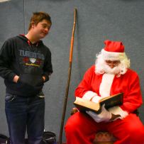 Als der Sack mit den Geschenken leer war gingen die meisten frisch gestärkt zurück an die Kletterwand, um die gerade zugeführten Kalorien gleich wieder in potenzielle Energie umzuwandeln. Der Sack aber wurde einem seiner weiteren Zwecke zugeführt. Einer wurde so gut es ging von einem nicht ganz authentischen, optisch aber ansprechenderen und so gar nicht Furcht erregenden Hans Muff in den Sack gesteckt.