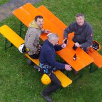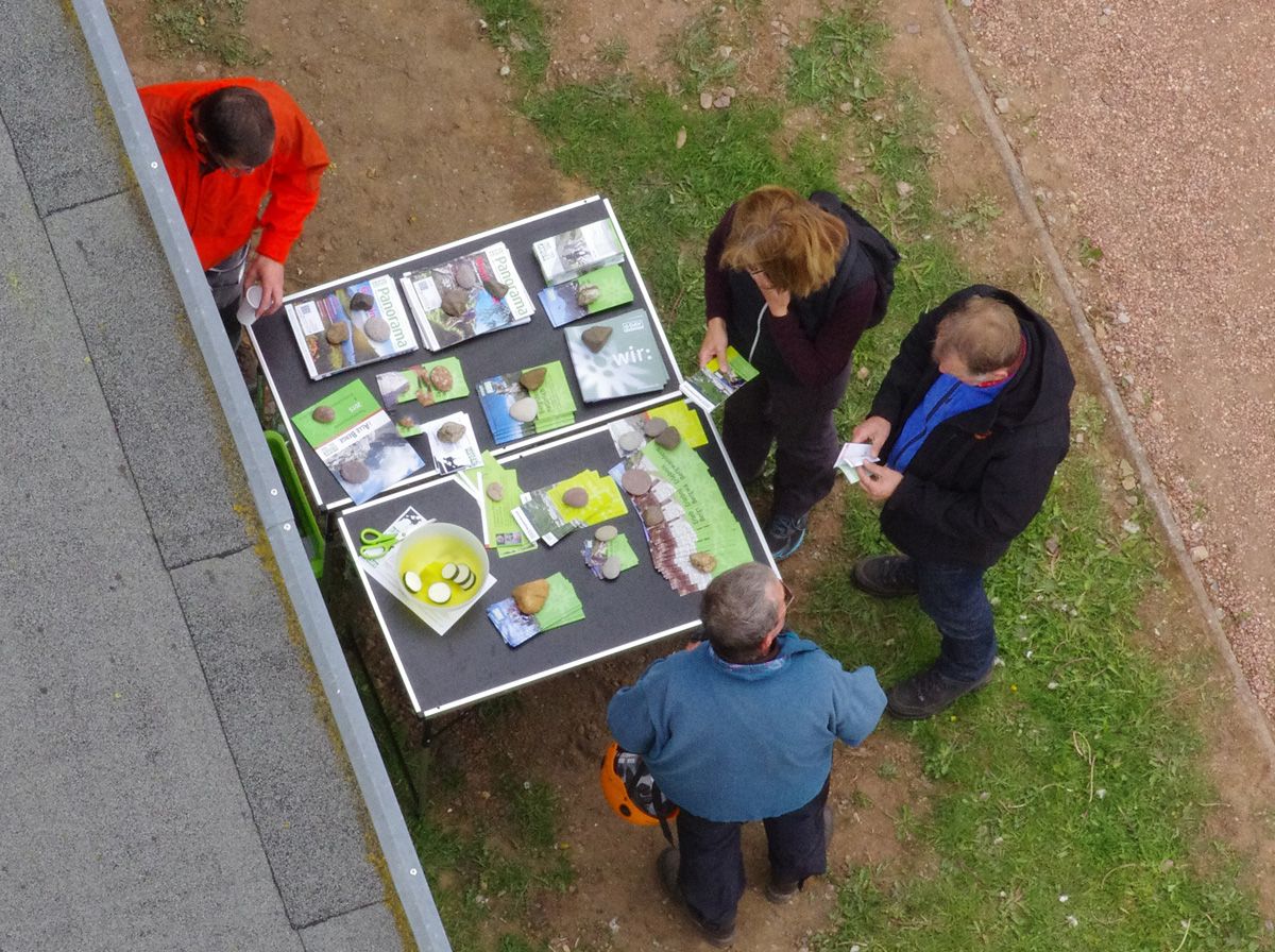 Anspruchsvolle Wetterbedingungen zur Einweihung des Turmes am Weißen Stein überwinden unsere Leute locker. Pünktlich zur Einweihung mit Publikum und Politik seilen sich vier Fachleute gleichzeitig aus etwa 25m Höhe bei Wind und Wetter ab, um den Offiziellen die Scheren zwecks Banddurchschneidung aus luftiger Höhe zu überreichen. Unter Applaus gelingt die geplante Einweihung schließlich. Anschließend finden sich noch mutige Besucher - ob klein oder groß -, die sich unter fachkundiger Anleitung abseilen lassen. Unsere Jugend zeigt dabei genausoviel Engagement wie unsere langjährigen Bergsteigerkollegen. Zwischendurch gibt es Kaffe und Kuchen, Pommes und Würstchen für die tatkräftigen Unterstützer. Die neben unserem Stand aufgebaute Slackline bekommt häufig Besuch.