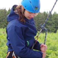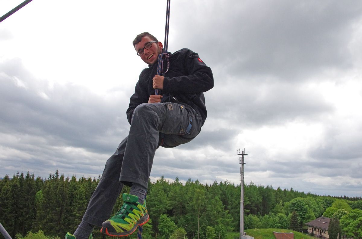 Selbst bis in den aufkommenden Regen des Nachmittags hinein halten alle gerne durch, denn die Begeisterung für das Abseilen ist auf die Besucher übergesprungen und kaum noch zu bremsen.
